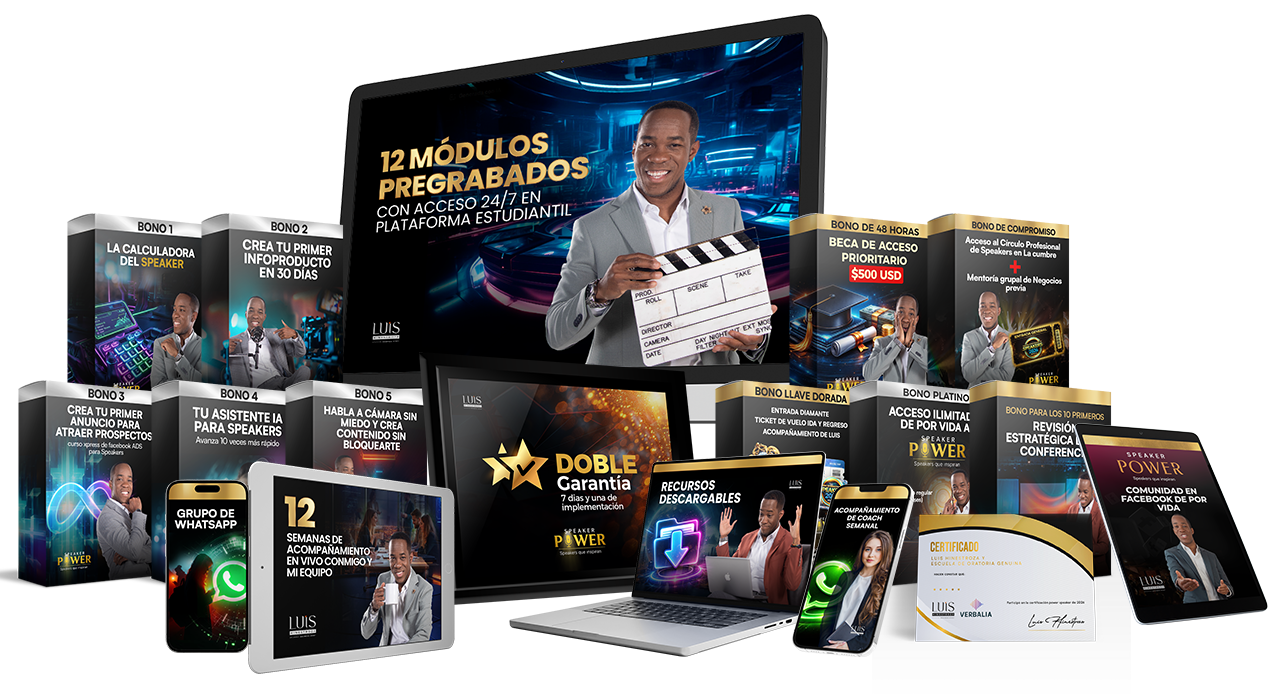 12 semanas de mentoría en vivo, estructura profesional de comunicación, método de monetización probado, acompañamiento de coach, comunidad de speakers de alto nivel y más de $1,385 USD en bonos.